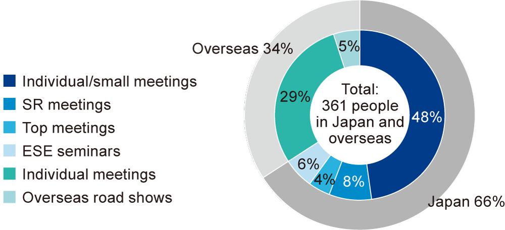 The Executive Officer in charge of IR conducts dialogue with overseas institutional investors from North America, Europe, and Asia regarding our management plan, business model, research and development, shareholder returns, and ESG matters (including one conference hosted by a securities company per year).